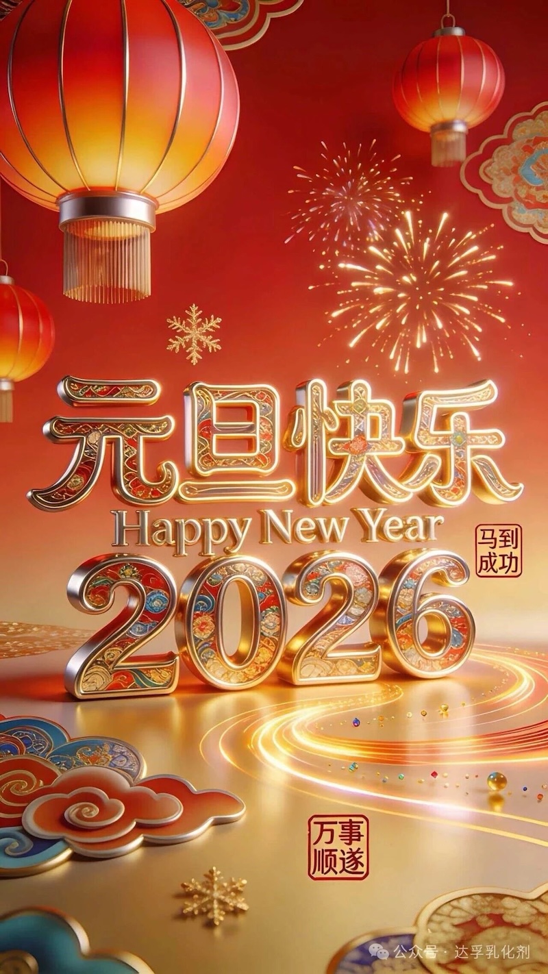 达孚乳化剂愿各位合作伙伴及家人们新岁如松,立根岩石而不移;似兰,处幽谷而自芬芳。于时序流转中悟“天行健”之进取,于日常点滴中品“地势坤”之厚载。元旦嘉平,顺遂长安。新的一年骏马奔腾,事业长虹。